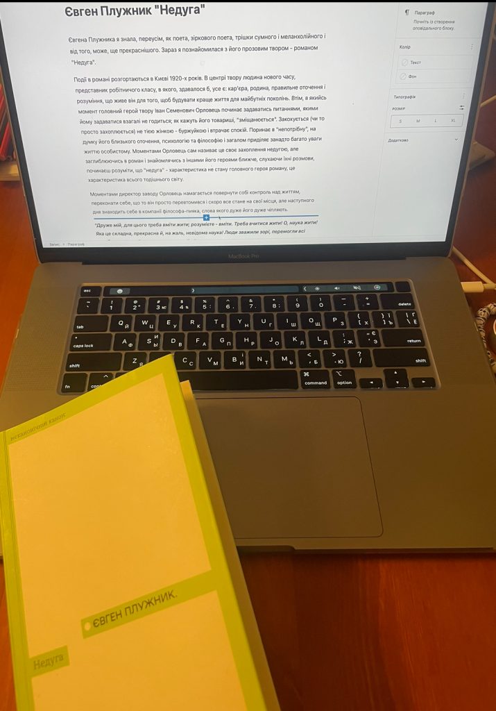 Євгена Плужника я знала, переусім, як поета, зіркового поета, трішки сумного і меланхолійного і від того, може, ще прекраснішого. Зараз я познайомилася з його прозовим твором – романом “Недуга”. Події в романі розгортаються в Києві 1920-х років. В центрі твору людина нового часу, представник робітничого класу, в якого, здавалося б, усе є: карʼєра, родина, правильне оточення і розуміння, що живе …
